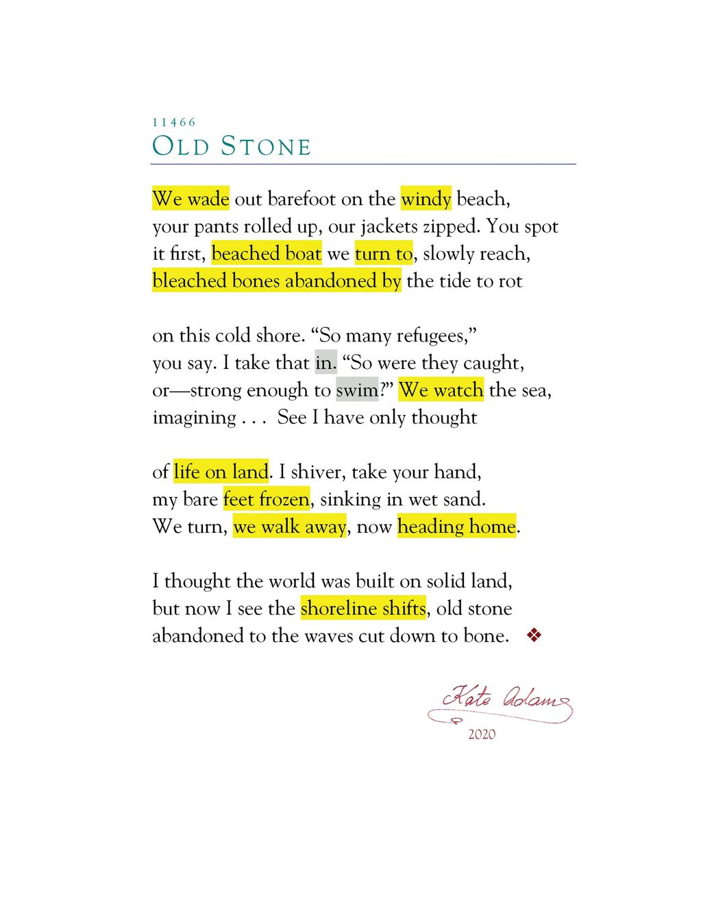 A study in the power of alliteration. This poem started with my lips loving “we wade,” a love I chose to honor throughout the poem: “windy,” “we watch,” “we walk away.” The yellow highlighting shows other alliterations: “beached boat,” “bleached bones abandoned by.” And I have a theory: we love alliteration to the extent it recapitulates our love of learning language itself, as infants.