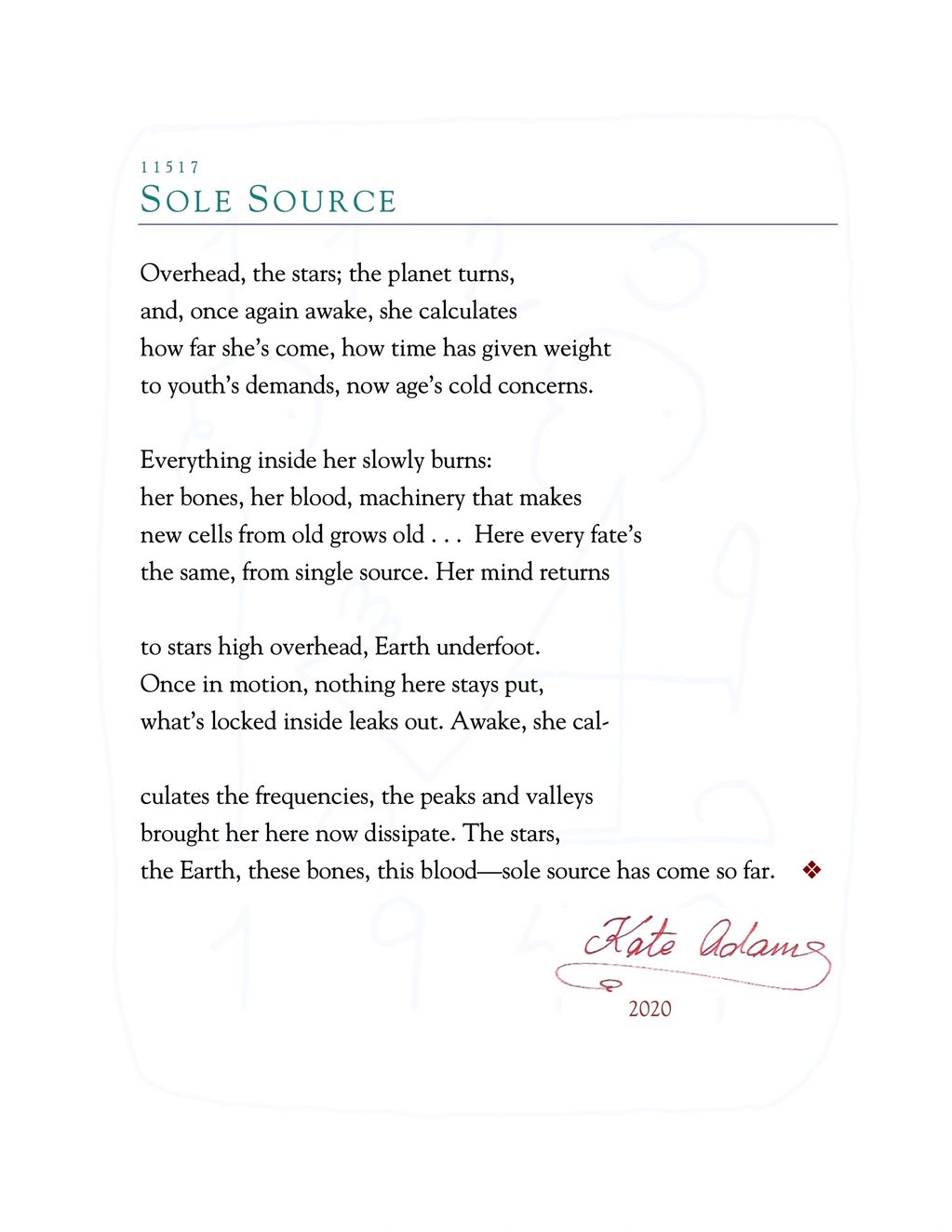 A sonnet that starts on the most mundane of surfaces—washing dishes—and, I like to think, dives deep, capturing, perhaps, the interplay between large and small, state and town, world and planet—and finally, a force behind it all, her father's love, and her own.